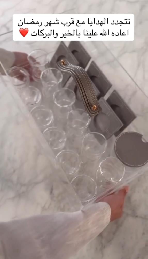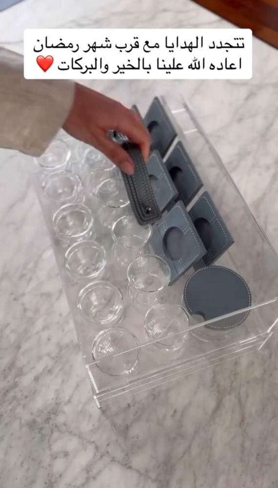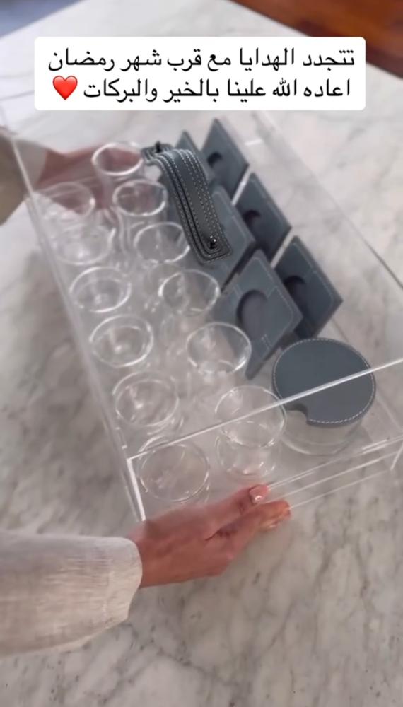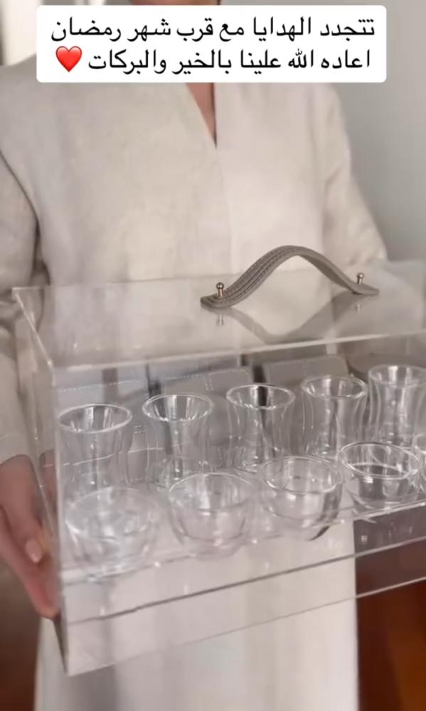 هدية جميلة وأنيقة عبارة عن بوكس اكريلك مع ٦ قاعدات جلد فخمة لبيالات الشاي و٦ فناجيل و٦ بيالات وعلية اكريللك بغطاء جلد وبالامكان الكتابة على هذا البوكس